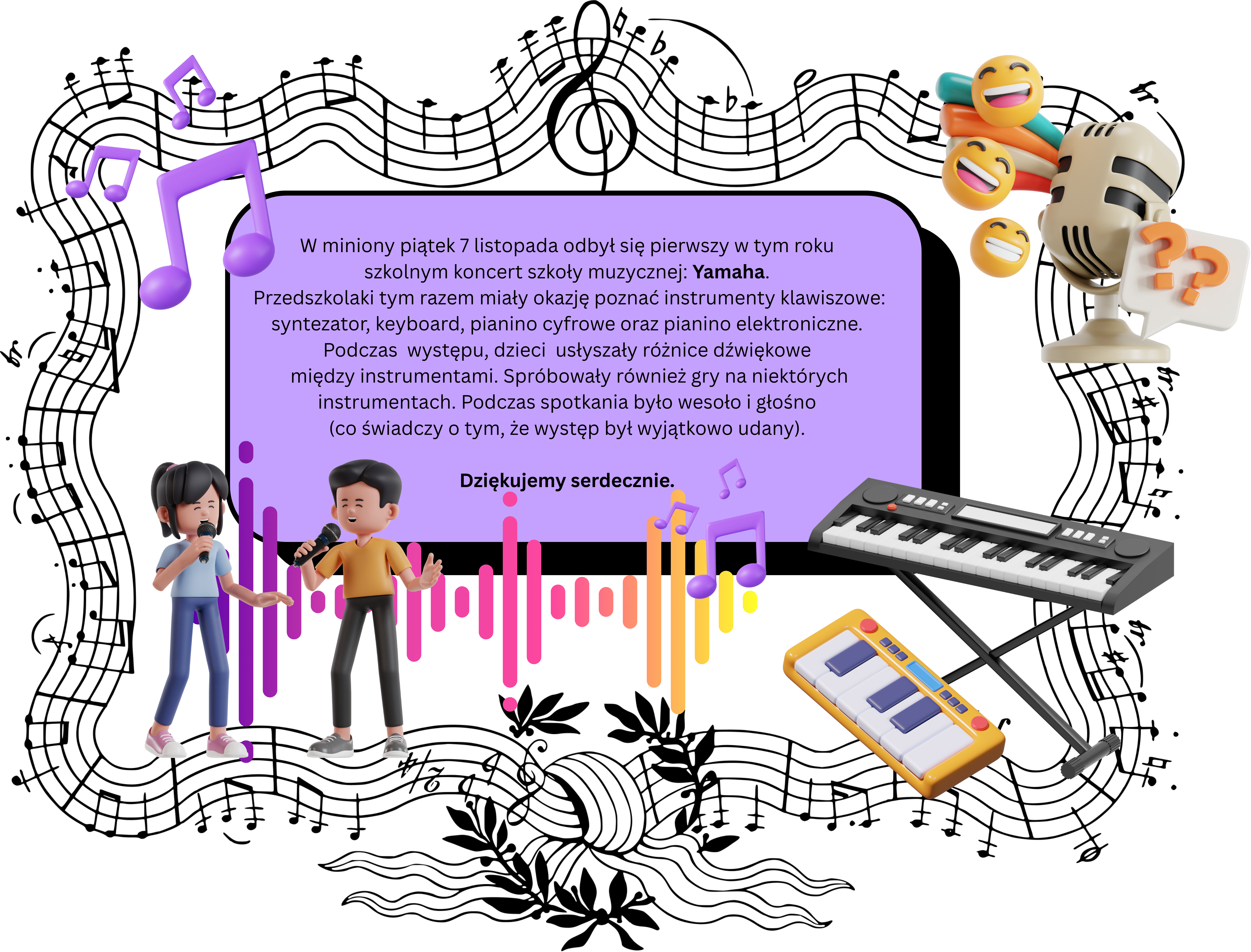 18 listopada nasze przedszkole uczestniczyło w koncercie zorganizowanym przez muzyków ze Szkoły Muzycznej Yamaha. Na początek wysłuchaliśmy utworu „Witajcie w naszej bajce” z filmu Akademia Pana Kleksa.