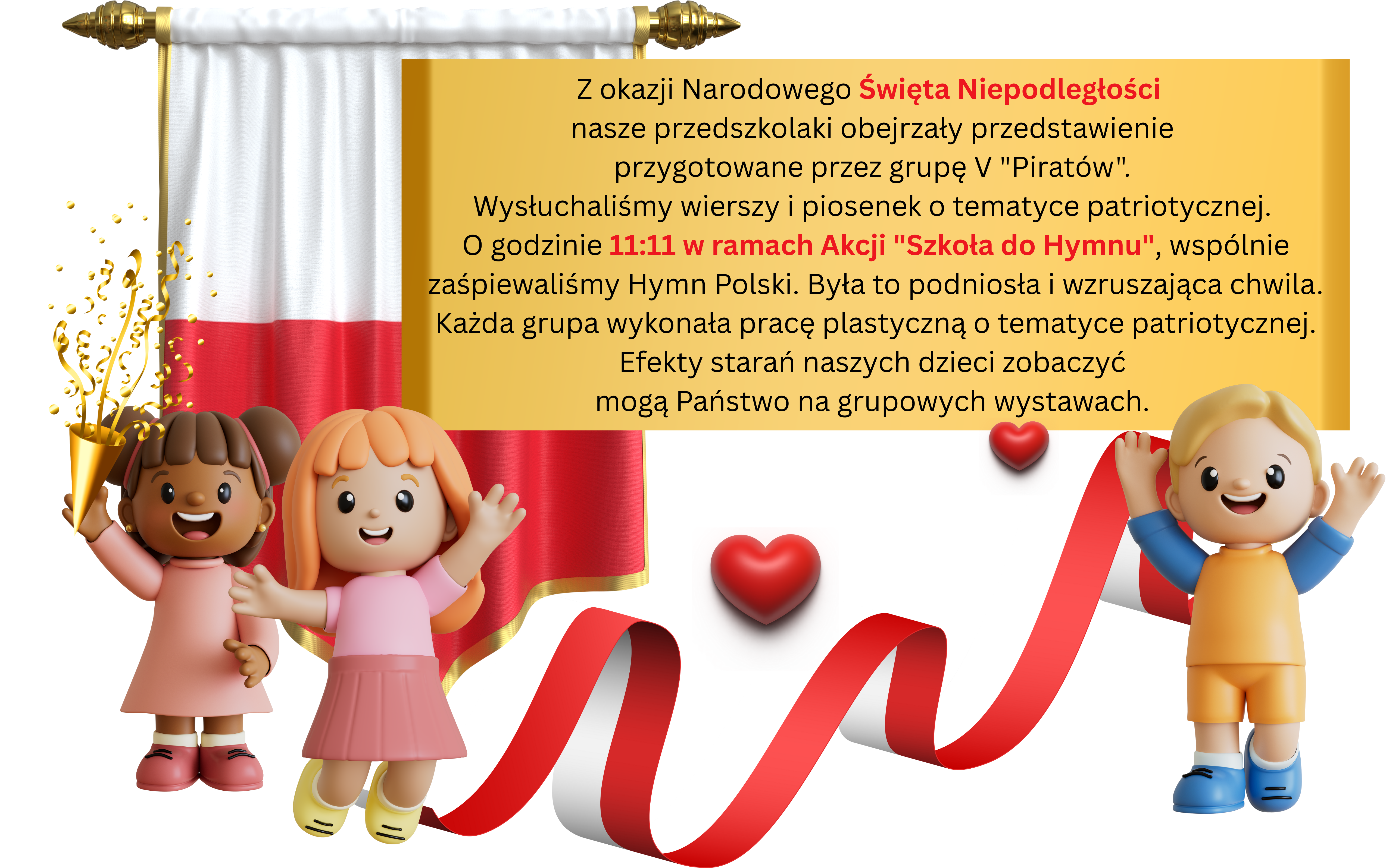W tym dniu dzieci utrwaliły wiadomości na temat symboli narodowych, wydarzeń historycznych naszej ojczyzny. Dumnie, przyjmując właściwą postawę „na baczność”, odśpiewały hymn Polski „Mazurek Dąbrowskiego” w ramach akcji Szkoła do hymnu. Przedszkolaki uczestnicząc w tego typu uroczystościach od najmłodszych lat uczą się patriotyzmu, poszanowania dla polskiej kultury i historii.